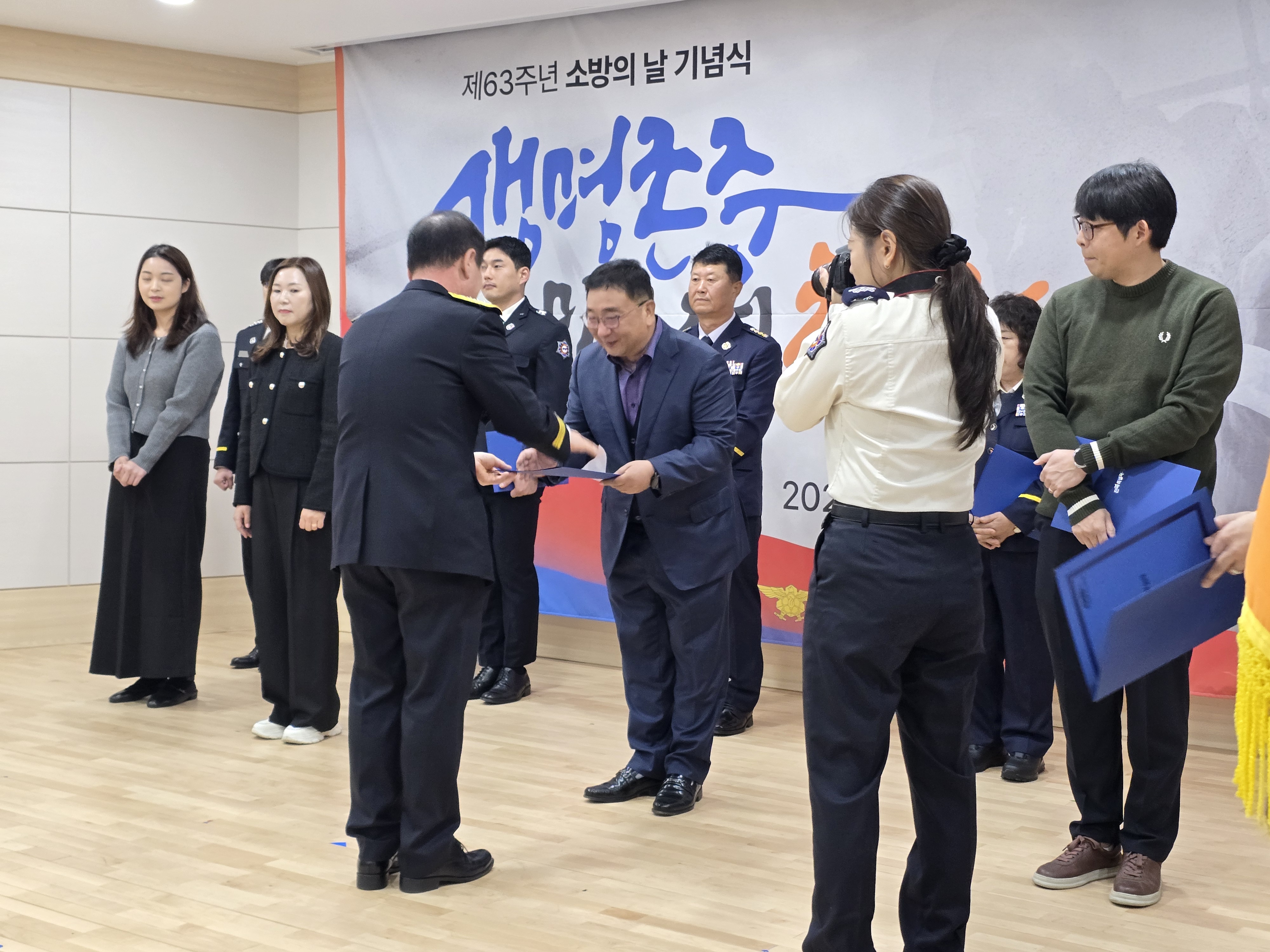 익산미소요양병원 정장택 이사님께서 평소 투철한 사명감과 남다른 열정으로 지역사회 복지 증진과 소방 안전문화 확산에 기여한 공로를 인정받아 2025년 11월 6일, 제63주년 소방의 날을 맞아 전북특별자치도지사 표창장을 수상하셨습니다. 병원과 지역사회를 위해 헌신하신 이사님의 노고에 깊이 감사드립니다. |